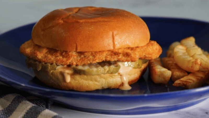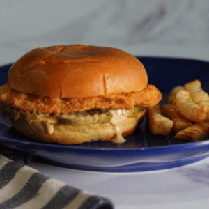 Recreate a classic fast-food favorite with our easy ButcherBox chicken strip sandwich, featuring a simple, spicy homemade sauce and crunchy pickles on a toasted brioche bun. Quick and delicious!