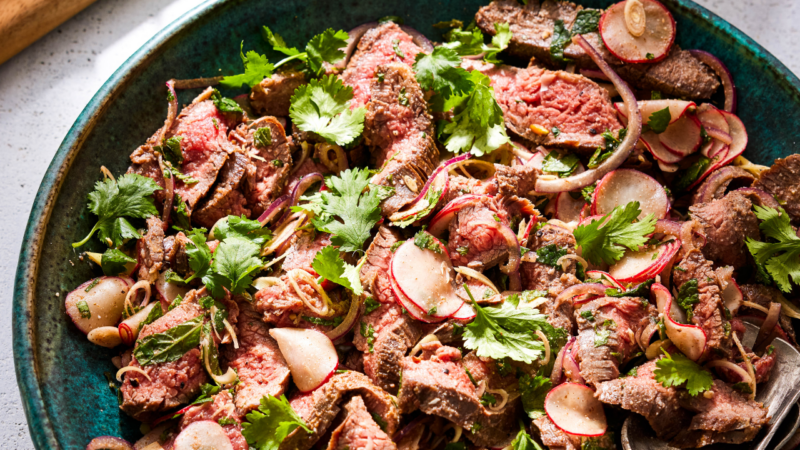 This salad featuring steak comes from Derek Rugsaken, the chef and owner of Southeast by Southwest, a Thai pop-up in Santa Fe, New Mexico. With origins in the northeast ‘Isaan’ region of Thailand, where Rugsaken’s father is from, the flavors and smells of this salad remind him of eating at the table with his dad as a child. “When I was young, my dada was unemployed for a time and we spent a lot of time together. The scent of lemongrass, mint and cilantro live deep in my memory, smelling them on his hands as he fed me bites of grilled meat or fresh yard-long beans from his garden” Rugsaken shares.
