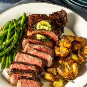 Looking to elevate your steak night? This Grain Finished NY Strip Steak with Herb Compound Butter is the perfect solution. Juicy, seared steak paired with crispy roasted potatoes and savory green beans—this meal brings together quality ingredients for a delicious, satisfying dinner.