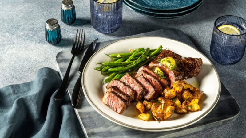 - Carve the steaks into slices, top with herb compound butter, and serve alongside the roasted potatoes and green beans.