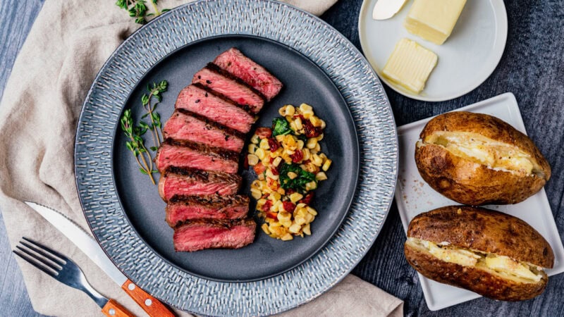 Looking for a simple yet gourmet meal to impress? This NY Strip Steak with Sweet Corn Succotash is a perfect choice. The juicy ButcherBox Grass Fed, Grain Finished NY Strip Steak is seared to perfection, while the sweet corn succotash adds a fresh, vibrant twist to this hearty dish. Paired with buttery baked potatoes, this meal is a delicious way to enjoy a balanced dinner with wholesome ingredients. Whether you’re cooking for a special occasion or just treating yourself to something flavorful, this recipe has you covered!