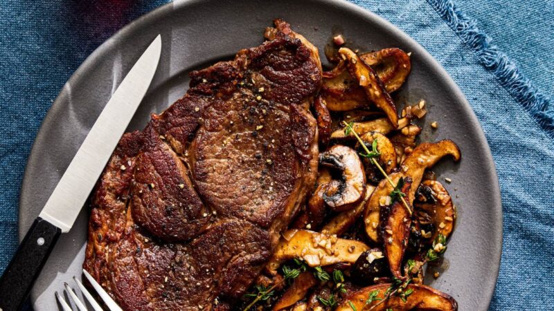 - Heat the canola oil in a large skillet, preferably cast iron (10- to 12-inch diameter), over medium-high. Cook steak, undisturbed, until a deep golden brown crust forms underneath, about 5 minutes. Turn over and cook on the second side until lightly golden brown, about 3 to 5 minutes. To brown the steak’s fat cap, stand it on its side with tongs and sear until browned to your desire. Steak will be done when an instant-read thermometer inserted into the thickest part of each steak registers 120º F. Turn off heat and transfer the steak to a serving platter to rest while you cook the mushrooms.