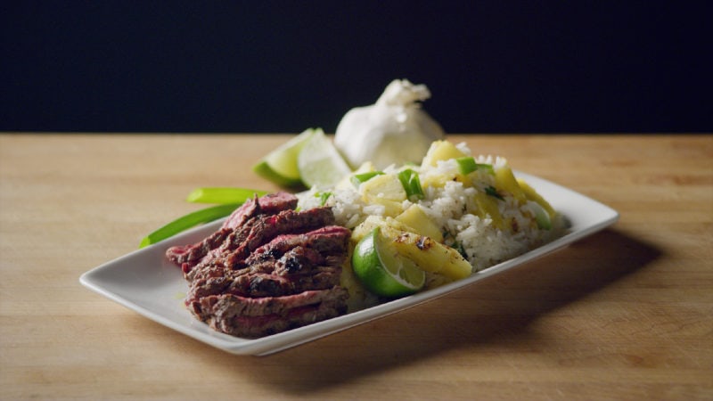 Tune in for a delicately fragrant and fully delicious way to cook those flat irons, along with the perfect side dish. As you can probably tell, I love pineapple. It obviously has amazing flavor on its own, but is ideal in marinades thanks to its tenderizing properties. Plus, good coconut rice can change your life, and adding pineapple will only make it better.