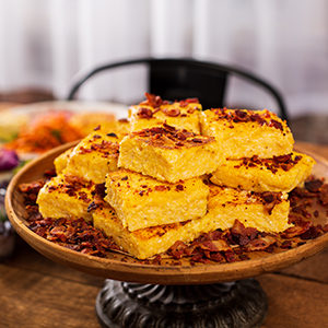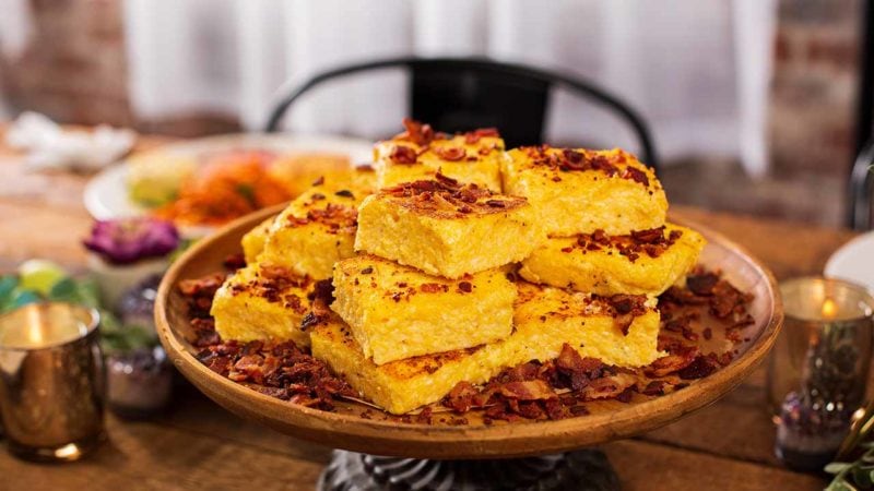 These warm polenta cakes bring a little extra comfort and flavor to any meal. The savory crunch of bacon paired with a hint of parmesan make these tasty cakes a perfect side for a soup, bread alternative or even a crouton in your favorite salad.