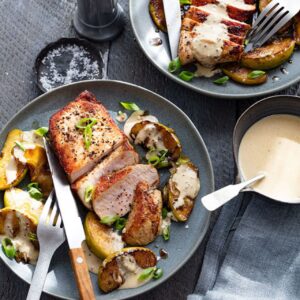 ButcherBox’s boneless sweet and savory pork chops get a good sear before being drenched in a creamy, apple-y sauce made up of sour cream, apple cider and, yes, apples. The overall effect is delicious—very autumnal and a nice warming dish for these chillier nights. This recipe can easily be halved.