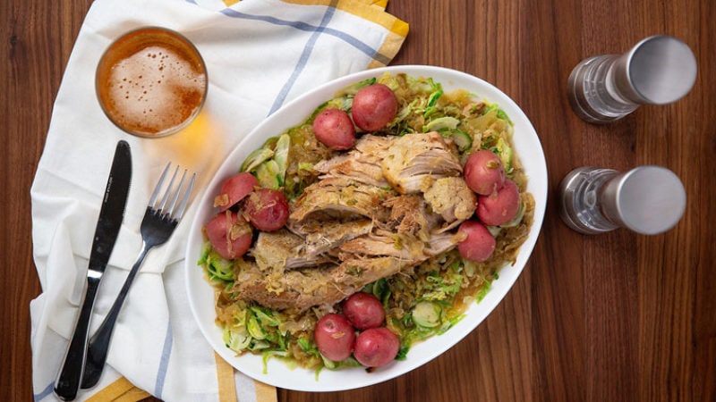 This hearty slow-cooker meal with potatoes and Brussels piles plenty of delicious flavor on your plate.