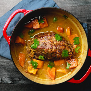 If you love a great sweet and savory combo, this recipe is for you. This delicious pork sirloin is prepared with coconut milk and sweet potatoes in a Dutch oven.