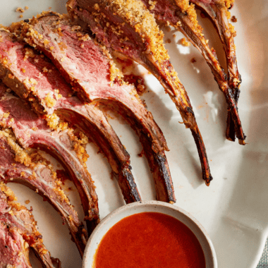 - On a cooling rack set on a baking sheet, place the crusted lamb rack with the crust side up and bake until an instant-read thermometer stuck into the thickest part away from the bone reads 125ºF for medium rare, about 12 minutes (roast longer for more well-done meat). Remove from the oven and place the racks on a cutting board to allow the meat to rest for about 10 minutes.
