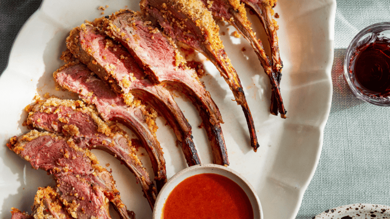 - On a cooling rack set on a baking sheet, place the crusted lamb rack with the crust side up and bake until an instant-read thermometer stuck into the thickest part away from the bone reads 125ºF for medium rare, about 12 minutes (roast longer for more well-done meat). Remove from the oven and place the racks on a cutting board to allow the meat to rest for about 10 minutes.