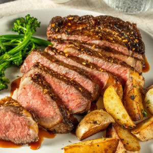 Treat yourself to a gourmet dinner with this Grain Finished Ribeye with Black Peppercorn Sauce. The ribeye is pan-seared to perfection, then drizzled with a rich, creamy peppercorn sauce, and served alongside roasted potatoes and tender broccolini. A perfect meal to impress or indulge!
