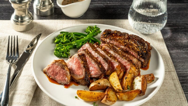 This recipe features juicy ButcherBox Grain Finished Ribeye Steaks with a rich black peppercorn sauce. Paired with crispy potatoes and tender broccolini, it’s a perfect blend of flavors for a gourmet meal at home.