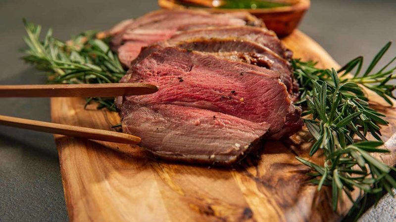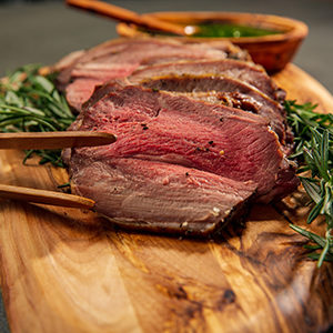 - After 15 minutes turn down oven to 325°F and continue to cook for 45-50 minutes or until meat thermometer inserted into thickest part reads 125°F for medium-rare. Let roast rest for 8-10 minutes before slicing and serving. Serve with mint pesto and enjoy!