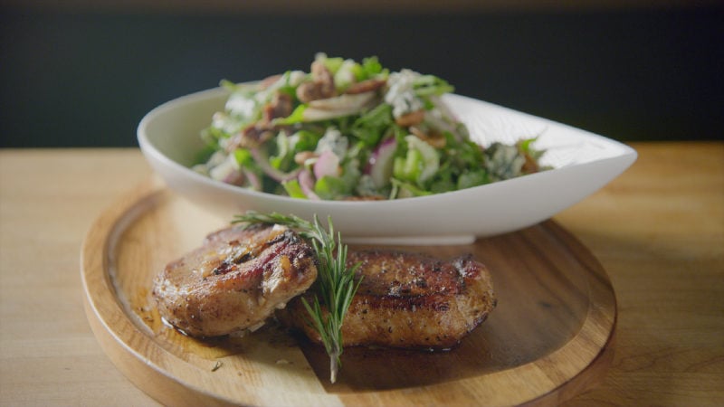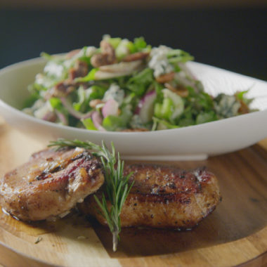 Prep this easy brine in the morning, and enjoy a quick-cooking, delicious pork chop dinner. The chops cook in 20 minutes and are fragrant with rosemary and shallots. A blue cheese and arugula salad rounds out the meal.