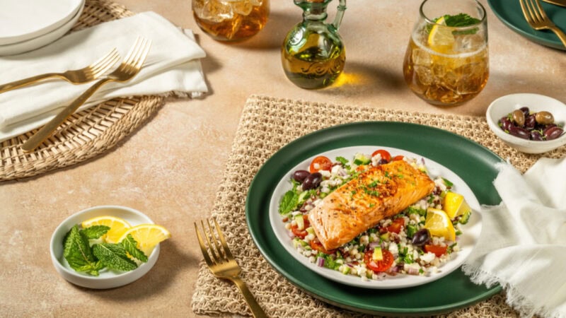 - For each plate put down a nice layer of grains topped with the marinated vegetables. Crumble feta on top and sprinkle with chopped parsley and torn mint leaves. Place the beautifully cooked salmon on top and serve with a lemon wedge on the side.