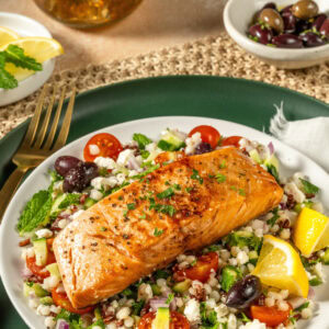Looking for a nutritious yet delicious meal that’s quick to whip up? This Salmon Grain Bowl combines the wholesome goodness of farro and Israeli couscous with perfectly seared ButcherBox salmon. Topped with marinated Mediterranean-style veggies and finished with crumbled feta and fresh herbs, this dish is an effortless way to enjoy a well-rounded, flavor-packed meal. Serve it up for lunch, dinner, or whenever you’re craving a hearty, healthy bowl that’s sure to satisfy!