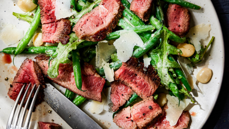 - Add the arugula and ¼ cup of the Parmesan to the bowl with the beans mixture; toss to combine well. Transfer to a serving platter or divide among 4 plates. Slice the steak thinly against the grain and arrange on top of the salad. Drizzle with a little more olive oil and sprinkle with the remaining Parmesan.