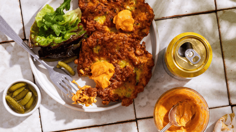 Crispy, rich and super satisfying, these shrimp fritters combine the sweetness of shrimp and corn with the tanginess of pickles and the spicy creaminess of Old Bay-spiked mayo. If you’ve never had Old Bay, it’s a zesty seasoning often used with seafood and contains paprika, celery salt, black pepper, cayenne pepper, mustard and other herbs and spices.