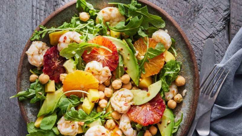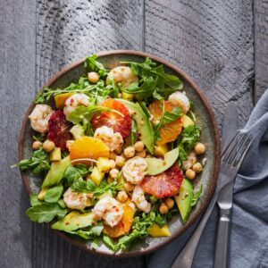 - Pour the olive oil into the citrus vinaigrette bowl, add the cooled shrimp and rice and toss to coat well. Toss in the orange discs and mango chunks then gently toss in the arugula. Season with salt.