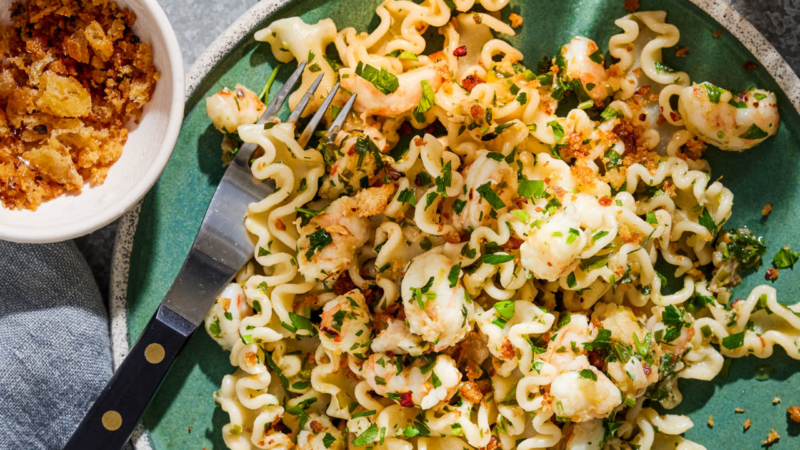- Add the pasta to the boiling water and cook until al dente, 7 to 9 minutes, or according to package instructions. Using a large spider or slotted spoon, transfer the pasta to the skillet with the shrimp, along with about ½ cup of the pasta cooking water. Toss to coat. Divide the pasta among 4 bowls, sprinkle with the breadcrumb mixture, garnish with the remaining parsley and serve.
