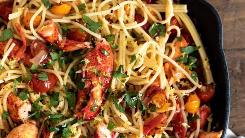 - Add lobster meat to skillet and toss to coat. Add pasta and ½ cup reserved pasta cooking liquid; season with salt and pepper. Cook, tossing constantly, until sauce thickens and coats pasta, about 2 minutes.