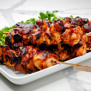- Place chicken skewers in the hot zone and grill about 5 minutes. Flip and move skewers to cool zone, brush with BBQ sauce and place lid on grill. Grill covered for 4 minutes, flip and brush with more BBQ sauce and grill 2 more minutes in the cool zone this time keeping grill open.