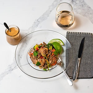 This Southeast Asian-inspired dish features buckwheat noodles and plenty of veggies, with a sweet, spicy, and salty almond and coconut milk sauce. The marinated flank steak cooks in a flash and makes a light-yet-hearty meal.