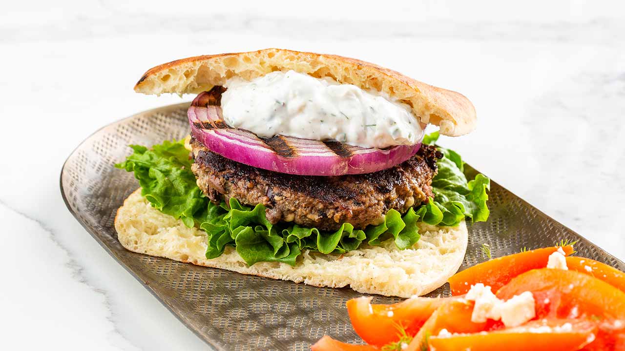 A homemade tzatziki makes every bite creamy and delicious. Serve these bison burgers sandwiched between pita halves for a fully Mediterannean-inspired meal.