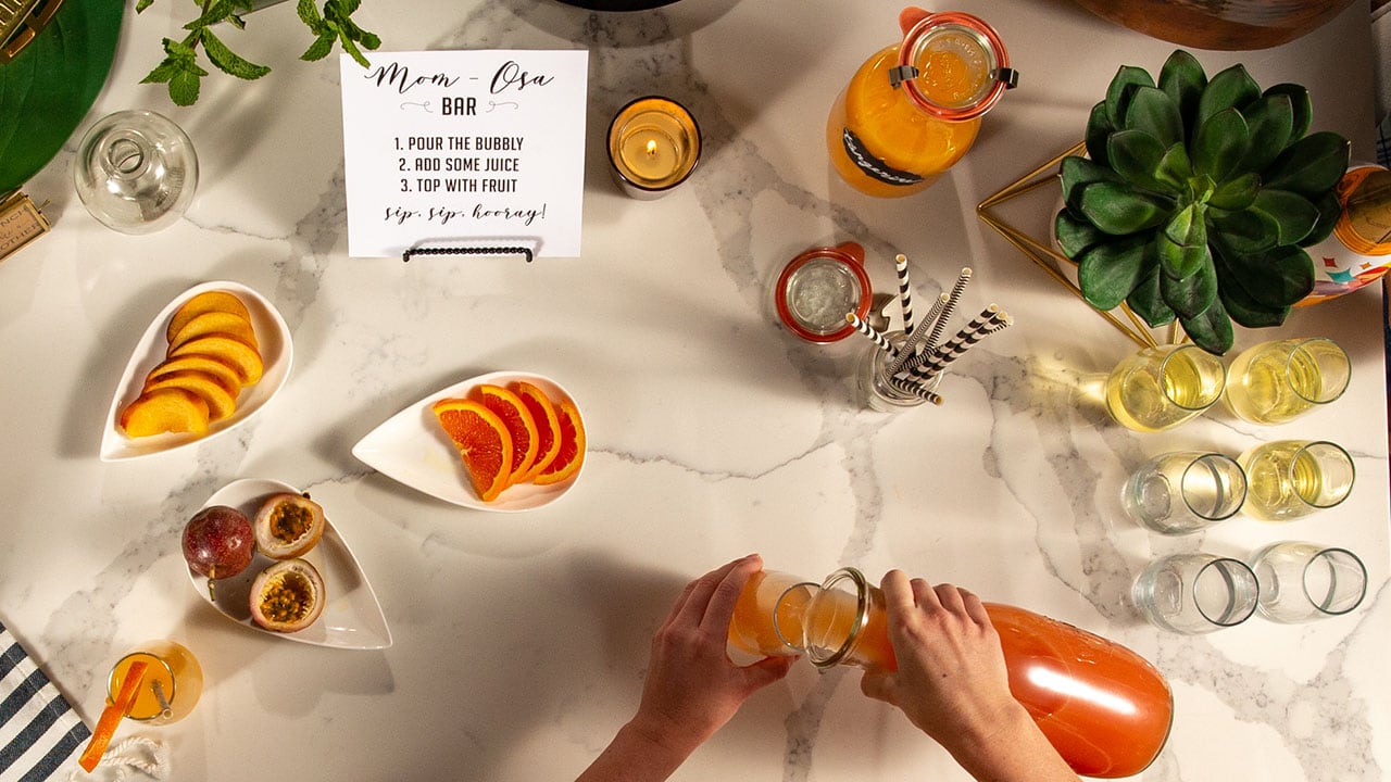 1. Setting the space. Whether you prefer to use a large dining room table, a corner of your counter space, or your kitchen island we recommend you designate a space for your “Mimosa Bar.”