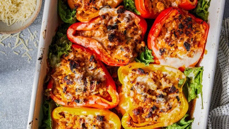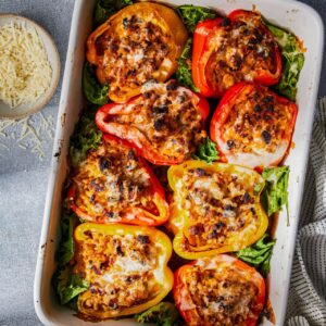 Super satisfying yet light, these stuffed peppers are garlicky, herbaceous (thanks to a generous amount of sage), bright with tomato and cheesy from melted layers of mozzarella. How could turkey not like being paired with such tasty flavors? Lastly, because it’s never bad to have some greens too, escarole (a slightly bitter green chicory) is roasted until tender along with the peppers.