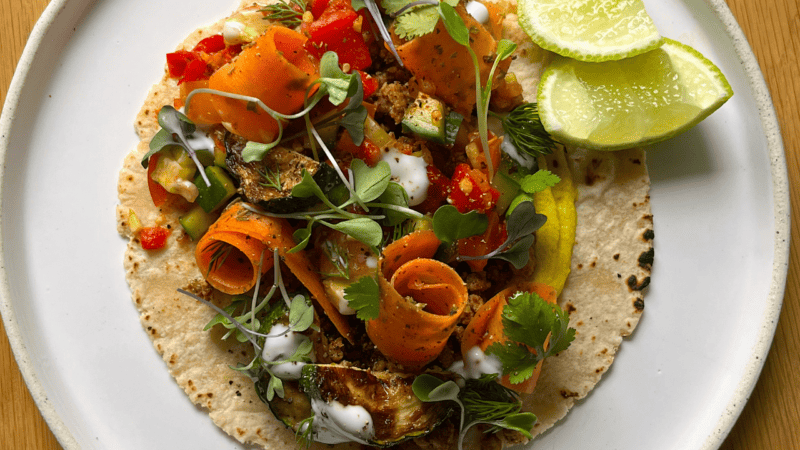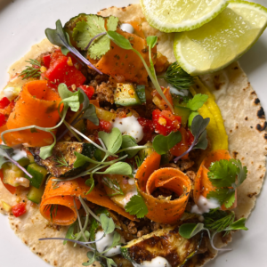 - Assemble tacos on tortillas of choice and garnish with lime, cilantro, greek yogurt, dill, and grilled veggies.