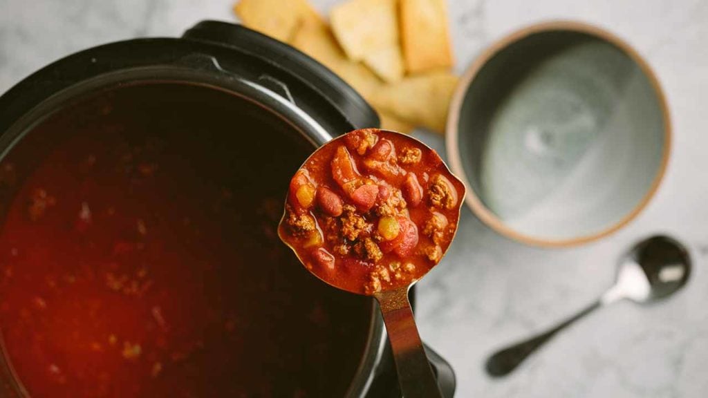 You can make this bean and beef-filled pot in under an hour, then pile it high with your favorite toppings. This version is fairly classic, with all the familiar trappings like crushed and diced tomatoes, kidney beans, ground beef, onion, cumin, and chili powder.