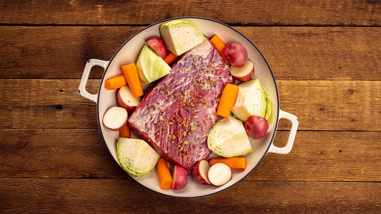 Corned beef brisket is most often associated with St. Patrick’s Day—especially when combined with cabbage and potatoes. And although the traditional “boiled dinner” does trace its roots to Irish-Americans celebrating the patron saint of the Emerald Isle, the dish isn’t exactly traditional Irish fare. In fact, corned beef can be enjoyed any time of year and in an array of creative dishes.